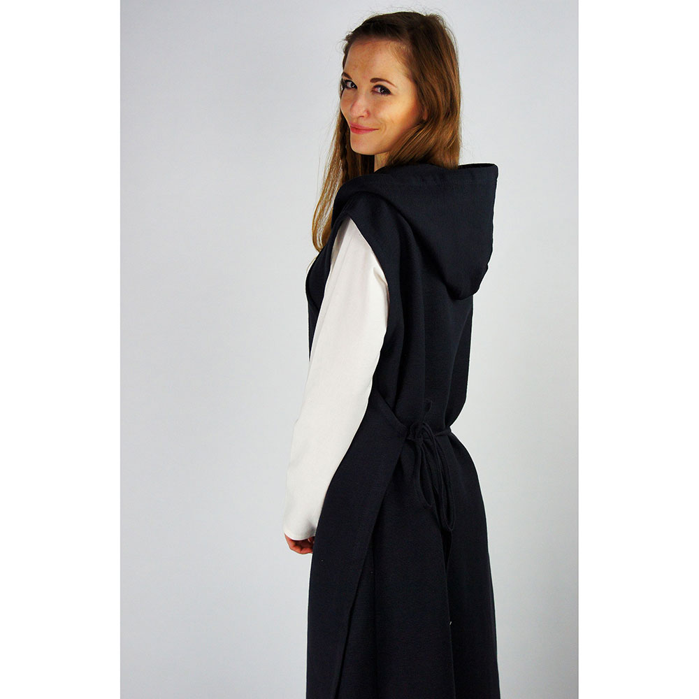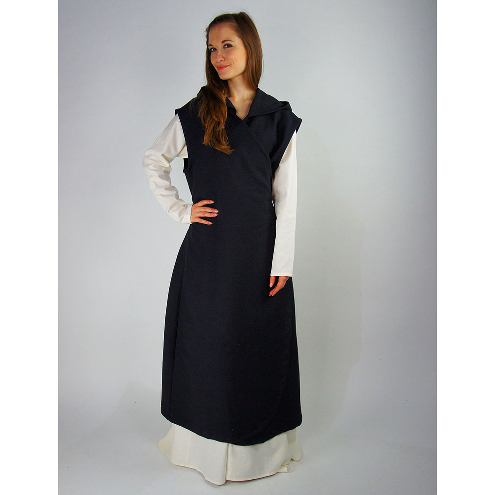 Kleid aus grober Baumwolle, mit Kapuze zum Wickeln, ärmellos und als Überkleid geeignet.